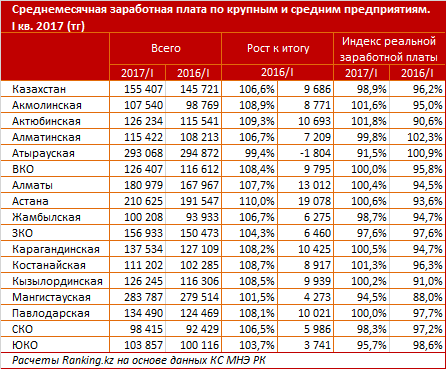 По итогам 1 квартала 2017 года среднемесячная зарплата казахстанских работников крупных компаний выросла быстрее, чем у остальных сотрудников, сообщает Ranking.kz. По итогам 1 квартала 2017 года среднемесячная заработная плата казахстанцев составляла 140,3 тысячи тенге, что на 5,6 процента выше, чем в аналогичном периоде годом ранее. В то же время для сотрудников крупных и средних предприятий этот показатель достигал 155,4 тысячи тенге - на 6,6 процента больше, чем годом ранее.