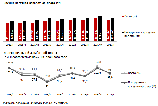 Примечательно, что хотя номинальные зарплаты работников больших компаний всегда были выше среднего по стране, ранее их покупательская способность снижалась сильнее и увеличивалась медленнее, чем в среднем по РК (102,6 процента против 103,8 в прошлом квартале и 96,2 против 97,3 процента в 1 квартале 2016).