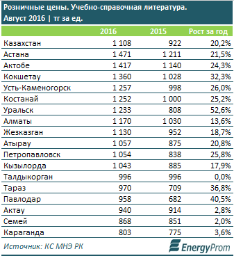 По информации аналитиков, в августе учебно-справочная литература обходилась потребителям в среднем по 1 108 тенге за единицу. Они отметили, что за год цены на эту литературу выросли на 20,2 процента. "Самые высокие цены по городам и мегаполисам РК отмечены в Астане (1 471 тенге, плюс 21,5 процента) и Актобе (1 417 тенге, плюс 24,3 процента), самые низкие - в Караганде (803 тенге, плюс 3,6 процента)", - отметили специалисты, добавив, что самое значительное подорожание произошло в Уральске - сразу на 52,6 процента за год, до 1233 тенге.