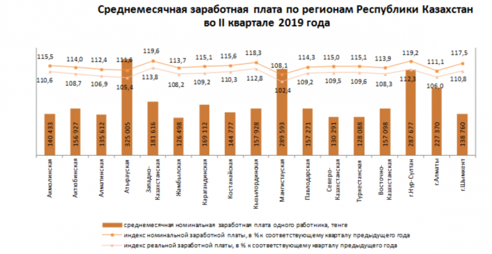 По данным ведомства, во втором квартале 2019 года среднемесячная номинальная заработная плата одного работника составила 186 537 тенге.