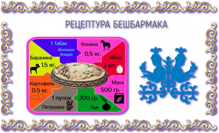 Поскольку в различных регионах страны бешбармак готовят по-разному, с разными ингредиентами, с разными сортами мяса, где-то с овощами, где-то без овощей, то нами разработана следующая унифицированная рецептура: