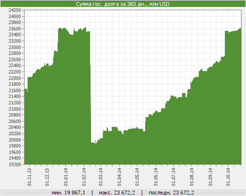 Ранее сообщалось, что 3 февраля 2014 года сумма госдолга Казахстана, выпущенного в виде ГЦБ, составляла 23,641 миллиарда долларов. Однако позже внутренний госдолг Казахстана по ГЦБ немного снизился и составил около 23,5 миллиарда долларов. Однако уже после корректировки курса сумма госдолга в долларах упала более чем на 20 процентов. Поясним, что, так как выплаты по гособлигациям происходят в тенге, следовательно в тенге сумма госдолга сохранилась на прежнем уровне, а в долларах упала на процент от корректировки курса.