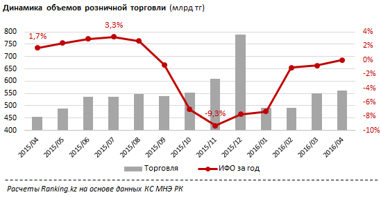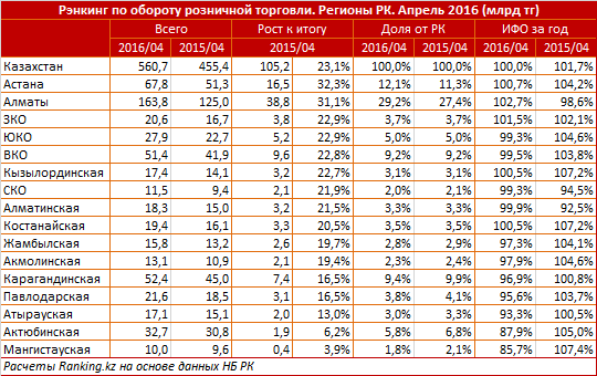 Отмечается, что физические объемы розничной торговли в апреле снизились в 11 регионах, выросли - в пяти. Наибольший спад наблюдается в Актюбинской и Мангистауской областях: на 12,1 процента и 14,3 процента соответственно (к апрелю 2015 года). А также в ряде других промышленных регионов - Атырауской, Павлодарской, Карагандинской областях. Небольшой рост зафиксирован в Алматы (+2,7 процента), ЗКО (+1,5 процента), Астане, Кызылординской и Костанайской областях (менее 1 процент), считают специалисты.