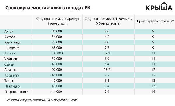 По данным аналитиков, период, за который окупится недвижимость, составляет в среднем 11 лет. Наименьший срок, девять лет, характерен для таких городов, как Актау, Актобе, Караганда и Шымкент (среди городов, в которых ведется мониторинг индекса "Крыши" и анализ цен на аренду - прим. krisha.kz).