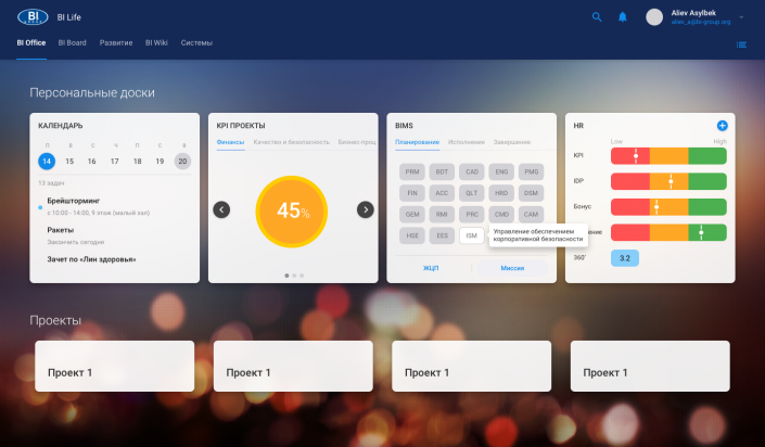 Еще один ключевой IT-продукт компании - внутрикорпоративный портал BI Life. По сути, это та же самая модель системы управления сотрудниками, которую представляют многие зарубежные IT-компании, такие как "Битрикс", Slack, Trello и другие. За одним исключением: в BI Group не ставят целью создать похожее приложение, а хотят сделать персональное, сочетающее в себе все лучшие разработки и решения, нацеленные как на результативную работу коллектива, так и на формирование общей корпоративной культуры. Сотрудник не только получает уведомления обо всех текущих персональных задачах и целях рабочей группы, но и может поздравить коллегу с днем рождения, вести адаптированный под свои цели календарь, создавать чаты для обсуждения вопросов и задач. На данный момент BI Life насчитывает порядка 7 000 сотрудников, 90 процентов из которых находятся в Казахстане, а остальные распределены по всему земному шару.