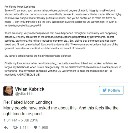 Дочь всемирно известного американского режиссера Стэнли Кубрика ("Тропы славы", "Спартак", "Космическая одиссея 2001 года", "Заводной апельсин", "Сияние", "Цельнометаллическая оболочка") опровергла популярную теорию заговора, согласно которой высадка американцев на Луну в 1969 году была подделкой, а ее отец якобы принимал непосредственное участие в фальсификации. На своей странице в Twitter Вивиан Кубрик впервые после смерти режиссера публично выступила против теории "лунного заговора".