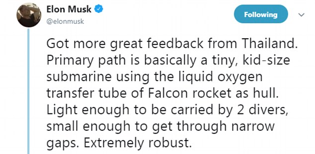 Ранее основатель SpaceX и Tesla предложил несколько вариантов спасения детей из пещеры Тхам Луанг. В частности, обсуждался механизм аварийно-спасательной капсулы, а также надувной трубы с воздушными шлюзами. Для этих целей к месту спасения заблокированных в пещере подростков прибыли представители Илона Маска - четыре инженера.