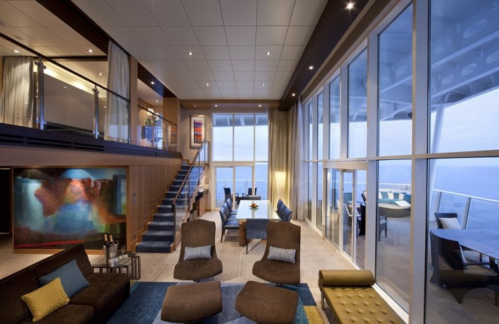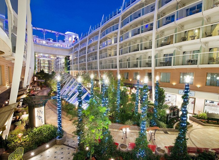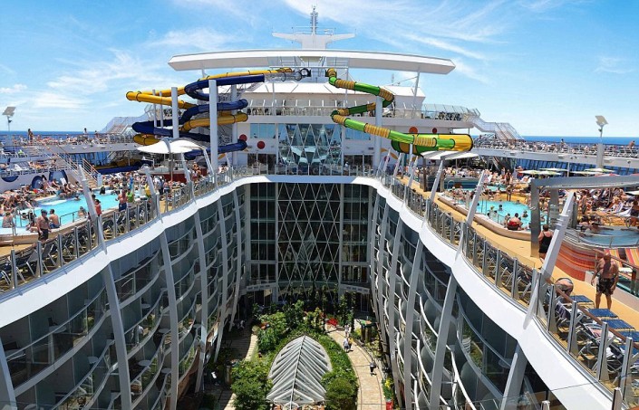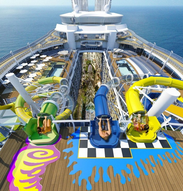На борту гиганта будут работать 40 ресторанов и десятки магазинов, театр на 1400 мест, бассейны с генераторами волн, мини-поле для гольфа, площадка для игры в баскетбол, многочисленные сауны и водная горка через все палубы, которая является самой длинной на аналогичных лайнерах.