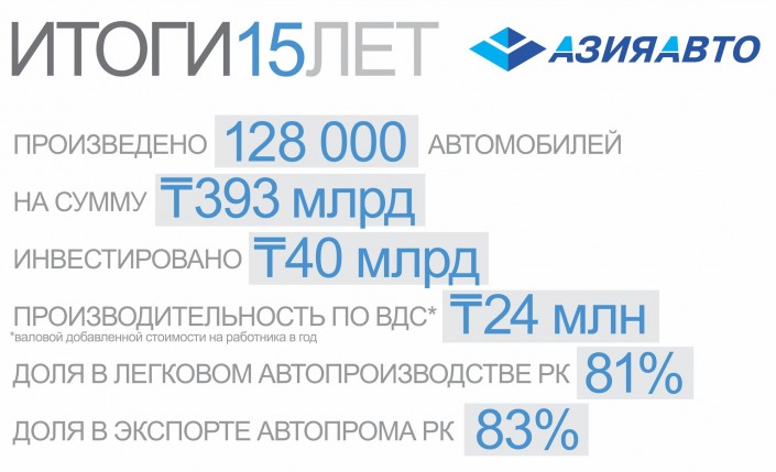 Казахстанский автопром отмечает 15-летний юбилей За 15 лет с конвейера "АЗИЯ АВТО" сошли более 128 тысяч автомобилей общей стоимостью 393 миллиардов тенге.