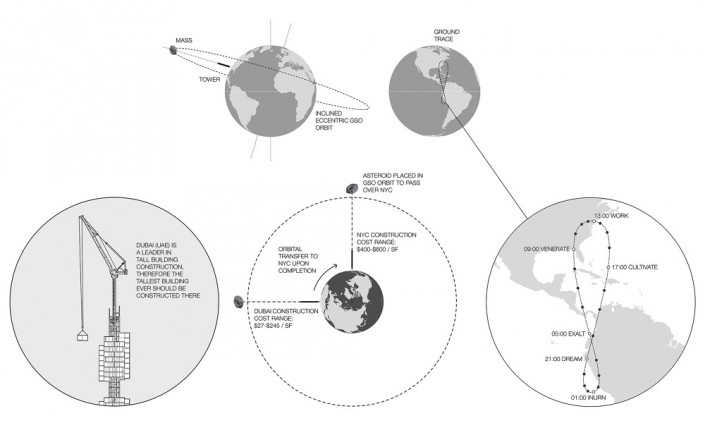 Архитекторы предлагают построить Analemma Tower над Дубаем, где недвижимость в 15 раз дешевле, чем в Нью-Йорке. Уже собранные модули будут подниматься с Земли, крепиться с расширяемому основанию башни, которая будет прицеплена кабелями к астероиду