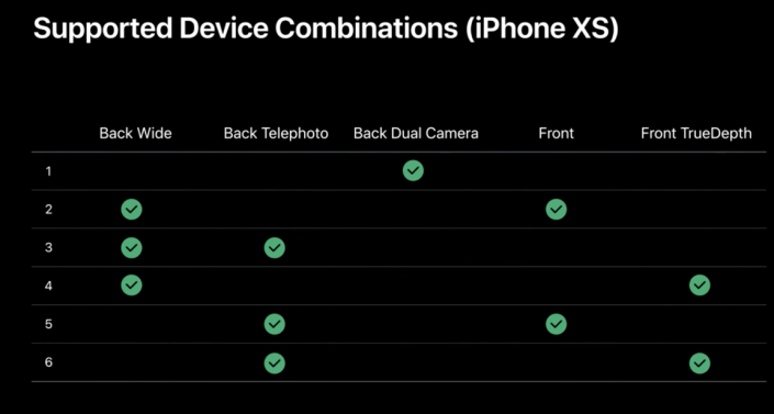 Список поддерживаемых комбинаций использования нескольких камер для iPhone XS. Скриншот Apple