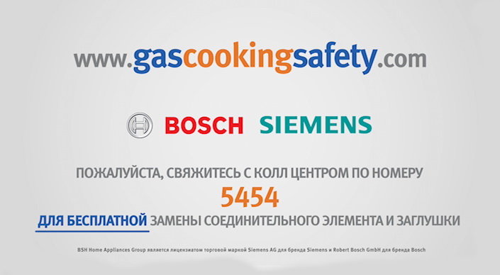 Если вы имеете или пользуетесь газовой варочной плитой, настольной газовой плитой или встраиваемой газовой варочной панелью марок BOSCH и SIEMENS, вам необходимо знать об опасности возможного повреждения соединительного элемента и заглушки, в связи с чем может происходить утечка газа, и в крайне редких случаях существует риск взрыва.