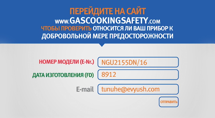 После этого вам необходимо перейти на сайт www.gascookingsafety.com, чтобы проверить, относится ли ваш прибор к добровольной мере предосторожности. Для этого необходимо указать в поле номер модели и дату изготовления, а также указать свои контактные данные. После отправки запроса вы узнаете, подвержен ли ваш прибор риску.