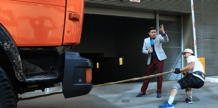 Кейіпкеріміз денесімен де, тісімен де бірнеше тонна көлік құралдарын сүйреген. Айтуынша, оған да біраз дайындық керек.
