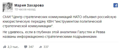 На исследование НАТО с юмором отреагировала официальный представитель МИД России Мария Захарова. "Не удивлюсь, если в глубинах этой аналитики Галустян и Ревва названы информационно-стратегическими подрывниками", - написала она на своей странице в Facebook.