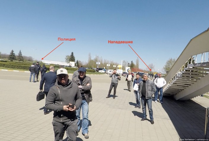 По словам Варламова, на выходе из аэропорта его облили зеленкой и "пару раз ударили". Блогер выложил фотографии нападавших, которые удалось сделать благодаря включенной камере GoPro.