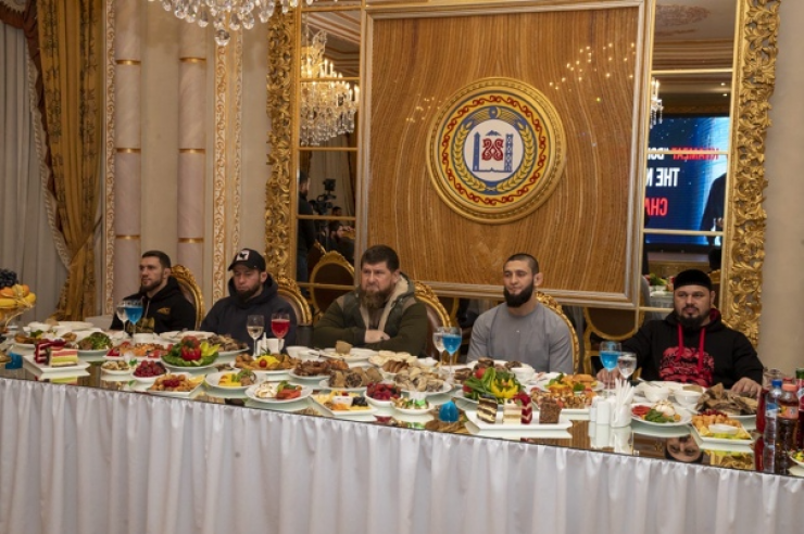На опубликованных главой Чечни фотографиях за накрытым столом сидит Рамзан Кадыров, вплотную к нему - Хамзат Чимаев, далее за столом расположились другие гости. На кадрах видно, что ни на одном участнике торжественного приема нет защитных масок.