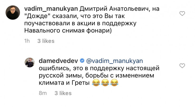 "Это не в поддержку Навального. Ошиблись, это в поддержу настоящей русской зимы, борьбы с изменением климата и Греты", - пошутил Медведев.