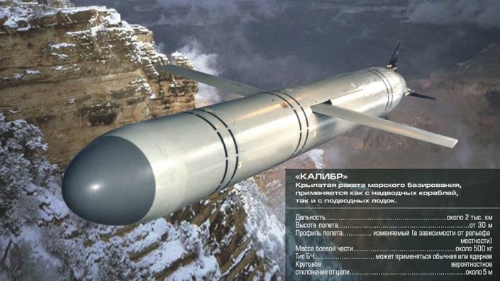 По его словам, крылатые ракеты "Калибр" практически незаметны для любых средств противовоздушной обороны. Точность поражения цели, несмотря на дальность применения (около 2 тысяч километров - Прим.), составляет несколько метров. "Учитывая, что масса боевой части составляет 500 килограмм, цель гарантировано уничтожается. Ракета может снаряжаться как обычной, так и специальной боевой частью - ядерной", - сообщил Конашенков.