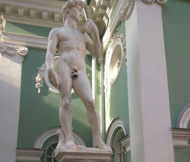 Художники из группы "Север-7" решили прикрыть наготу статуи Давида в Санкт-Петербурге, сообщает телеканал НТВ.