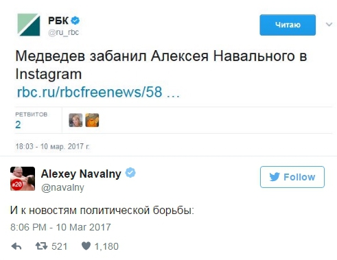 После публикации расследования ФБК премьер-министр Дмитрий Медведев закрыл для Навального доступ на свою страницу в Instagram. Об этом оппозиционер сообщил в своем Twitter.