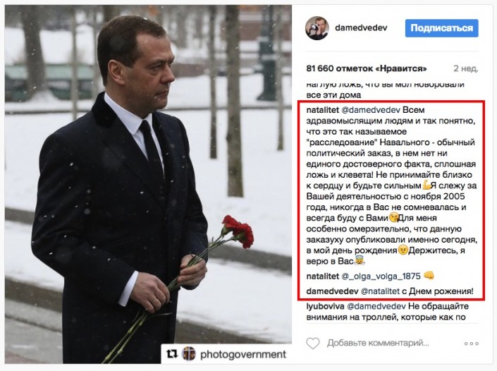 Под комментарием некой Натальи, где она назвала расследование Навального политическим заказом ложью и клеветой, а в конце посоветовала ему "держаться", Медведев написал: "С Днем рождения!".
