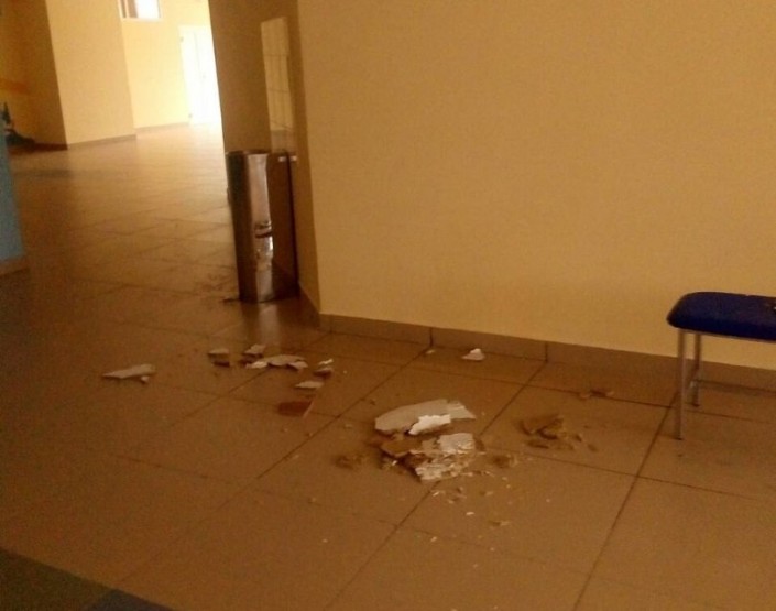 Местные жители рассказали изданию, что после двух дней дождей крыша здания протекла, стали отваливаться фрагменты потолка и штукатурка, плитка в туалете и краска на стенах пошли трещинами, есть подтеки ржавой воды в помещениях.