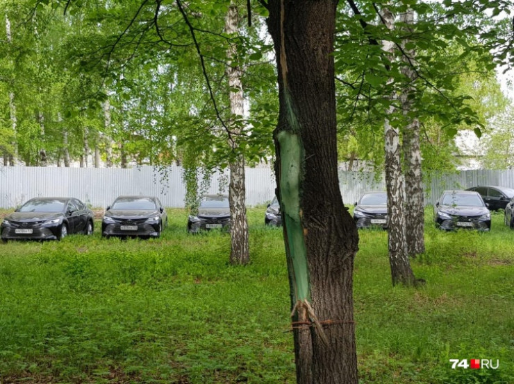 Абсолютно все иномарки черного цвета, внешне абсолютно одинаковые. Машины представительского класса стоят прямо под открытым небом и деревьями, припаркованы на участке рядом с озером Смолино.