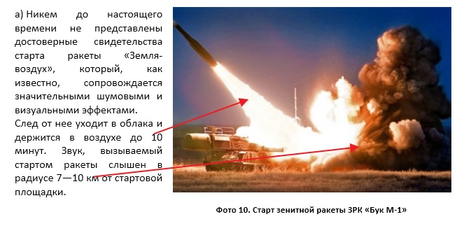 Говоря о первой версии, эксперты отмечают один важный момент: пуск ракеты "Бук-М1" сопровождается аудиовизуальными факторами. "Однако никем до настоящего времени не представлены достоверные свидетельства старта ракеты "земля-воздух", - считают эксперты.