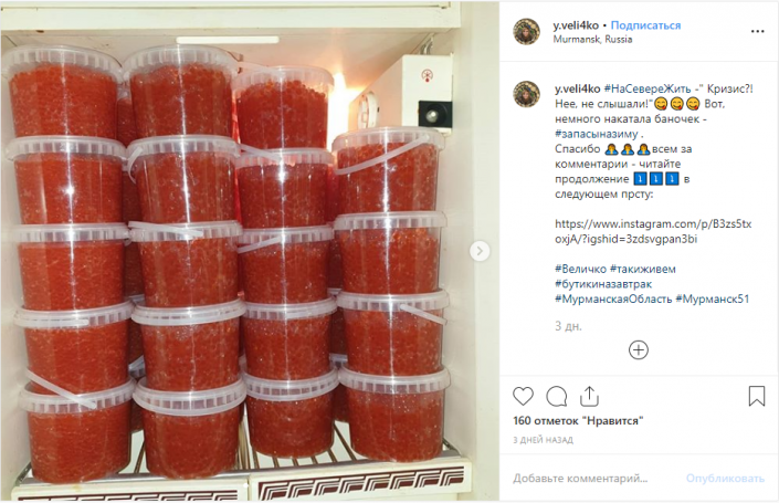"К сожалению, на предыдущем фото - не мой холодильник. А в моем икры нет, зато есть варенье морошковое и брусничное - тоже дары Севера, вкусные и полезные! Однако это не отменяет факта, что с икрой в Мурманской области все в порядке. Так что все, кто уже купил билеты на переезд в наш регион, точно не разочаруются", - написала Величко.