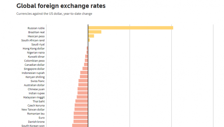 • Самая сильная валюта в мире: рубль, которого десятилетиями избегали даже россияне из-за его слабости и волатильности, на сегодняшний день является самой эффективной валютой в мире по отношению к доллару США с начала года.