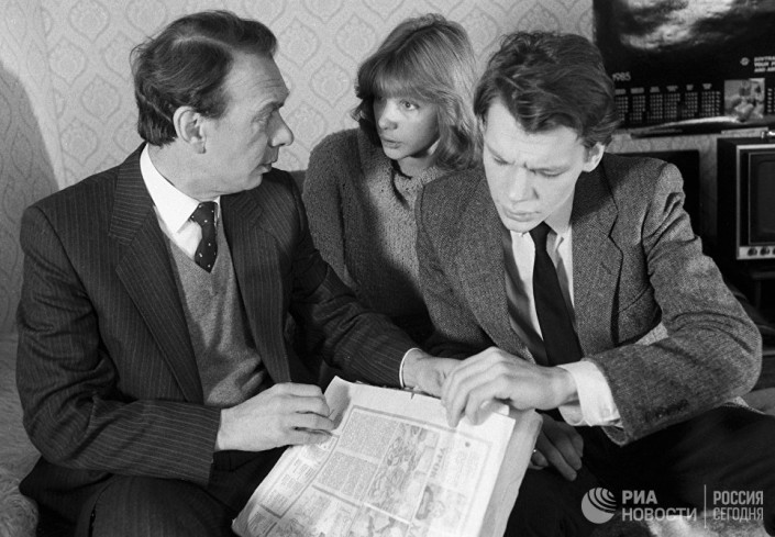 Народный артист СССР Алексей Баталов, Вера Глаголева и актер Никита Михайловский на съемках фильма "Зонтик для новобрачных". Фото ©РИА Новости/Галина Кмит