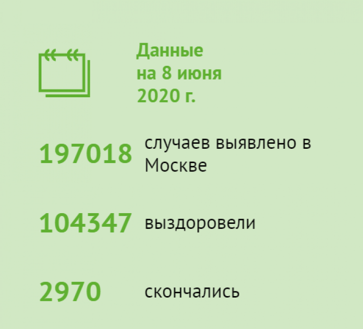 По данным официального сайта мэра Москвы, в городе выявлено 197 018 случаев заражения коронавирусом, из них 104 347 - выздоровели, 2970 - скончались. Таким образом, активных больных в городе 89 701 человек.