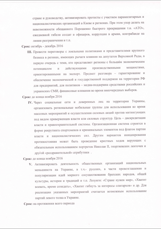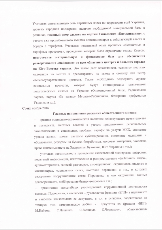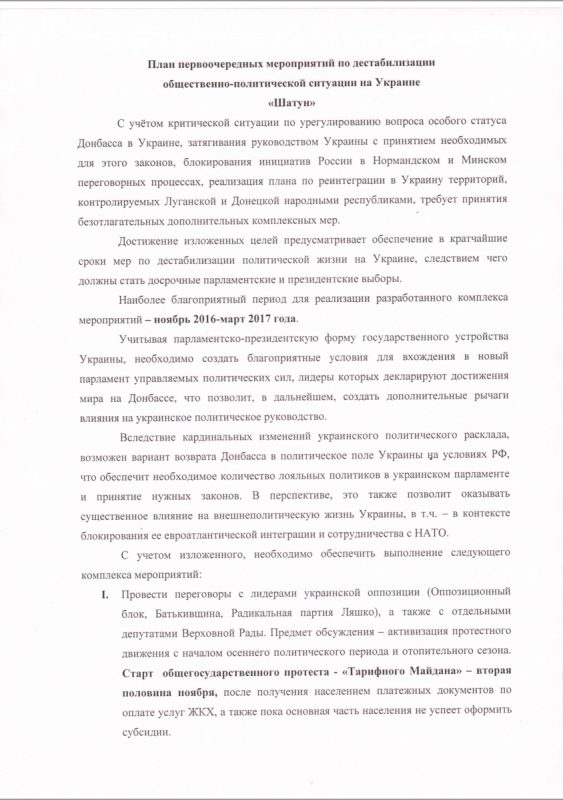 Сканы документов хакеры выложили в общий доступ. В одном из них необходимость дестабилизации обосновывается тем, что Украину нужно принудить вернуть Донбасс в свой состав на условиях России. Цель дестабилизации - досрочные парламентские и президентские выборы, сроки мер - ноябрь 2016 - март 2017 года.
