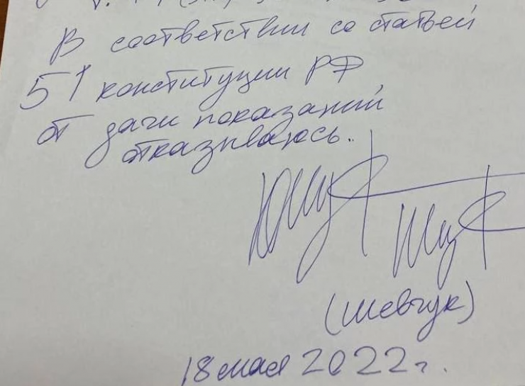 Адвокат лидера ДДТ уточнил, что решение об отказе давать объяснения по административному делу Шевчук принял во время составления протокола, сославшись на 51-ю статью Конституции РФ.