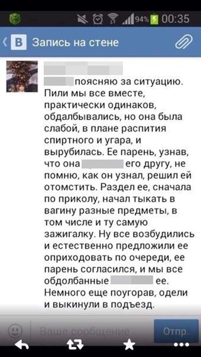 "Максим ушел за водкой, а когда вернулся, увидел, что его подруга оказывает интимные услуги одному из друзей. Когда девушка отключилась после выпитого и употребленных наркотиков, ее друг решил отомстить", -  изложили в соцсетях свою версию произошедшего авторы скандальных снимков.