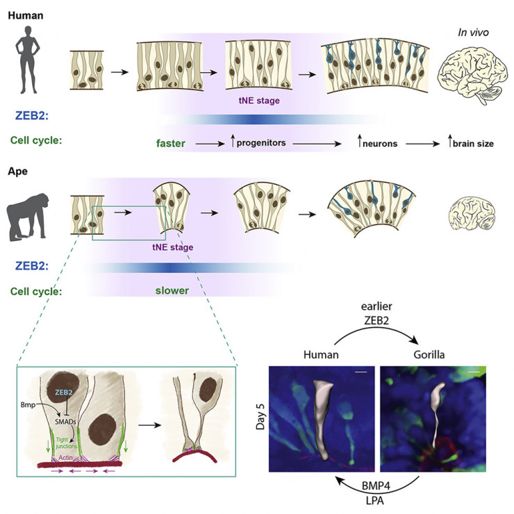 Скорость развития нейронов в зародышах ученые связали с активностью гена ZEB2 и связанных с ним участков ДНК. Так, у приматов он начинает активироваться раньше, у людей - намного позже.