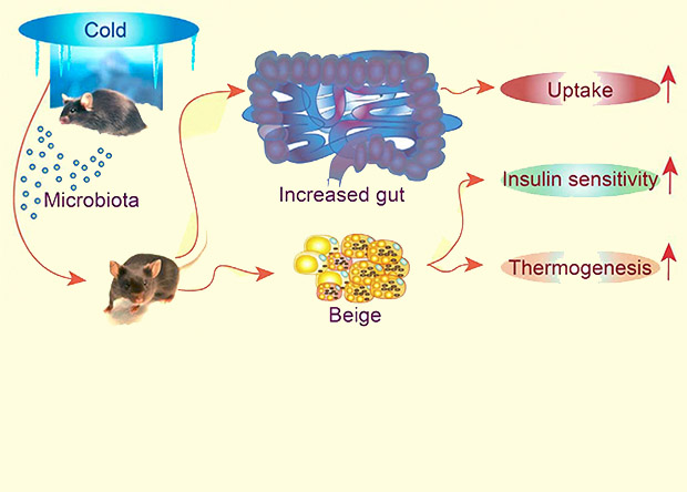 Затем физиологи пересадили микробиом живших на холоде мышей двум другим группам подопытных мышей, предварительно лишенных собственного микробиома и проживающих в нормальных температурных условиях. В обоих случаях в организмах экспериментальных животных начались такие же изменения, как если бы они были подвергнуты длительному воздействию холода: снижение сахара в крови, потеря веса, превращение белого жира в бурый, повышение чувствительности к инсулину и, в конечном счете, такое же увеличение размеров кишечника. Одновременная пересадка Akkermansia muciniphila вместе с "холодовым микробиомом", либо в условиях воздействия на животное холодом, предотвращает увеличение площади кишечника, позволяя значительно продлить эффект "похудения" во времени.