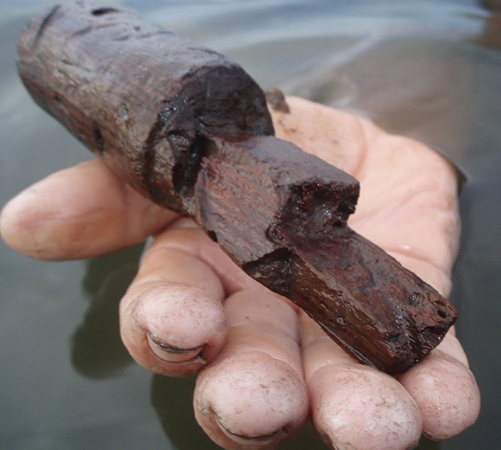 В ходе подводных раскопок ученые рядом с остовом деревянных помостов, которым был покрыт пол шахты, наткнулись на долото из жадеита (полупрозрачный зеленоватый минерал) и ручку из палисандра (ценная твердая древесина).