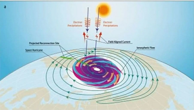 Ученые проанализировали странный вихрь плазмы, появившийся над Северным полюсом с августа 2014 года. По их словам, огромный космический ураган распространился на территорию в тысячу километров над Северным полюсом и длился почти восемь часов. Он вращался против часовой стрелки - так же, как ураганы на Земле в северном полушарии.
