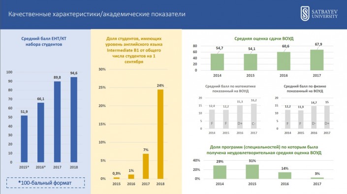 Как видно из приведенных диаграмм, доля неудовлетворительно оцененных Министерством образования и науки программ снизилась в 10 раз, произошел рост как средней оценки ВОУД, так и результатов по точным наукам. С введением с 1 сентября 2016 года интенсивной языковой подготовки доля студентов, владеющих английским языком на уровне Intermediate B1, выросла с 0,3 процента до 24 процентов.