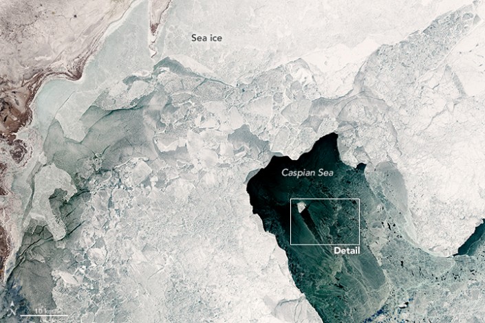 Спутник заснял необычную льдину в Каспийском море Фото с сайта earthobservatory.nasa.gov