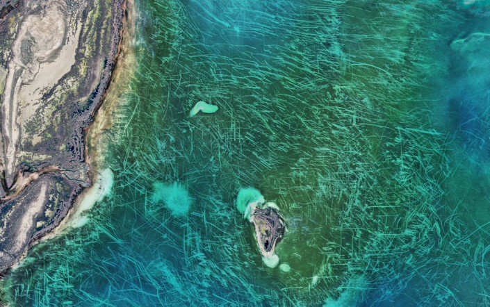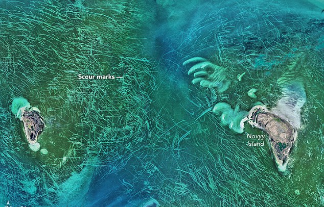 Странные следы на дне Каспийского моря разглядели ученые NASA на снимках со спутника, сделанных в районе архипелага Тюленьи острова на территории Казахстана. Из космоса дно водоема в этом месте выглядит словно поцарапанное проволочной мочалкой. В своем Twitter американское космическое агентство спросило читателей, что это может быть.