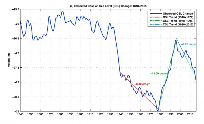 Причиной усыхания водоема называется повышение температуры приповерхностного слоя атмосферы (за последние 30 лет примерно на один градус Цельсия) из-за глобального потепления. Наиболее важным фактором, влияющим на уровень Каспийского моря, оказалось испарение воды. Количество осадков и объем воды в окружающих реках не так сильно отражаются на нем.