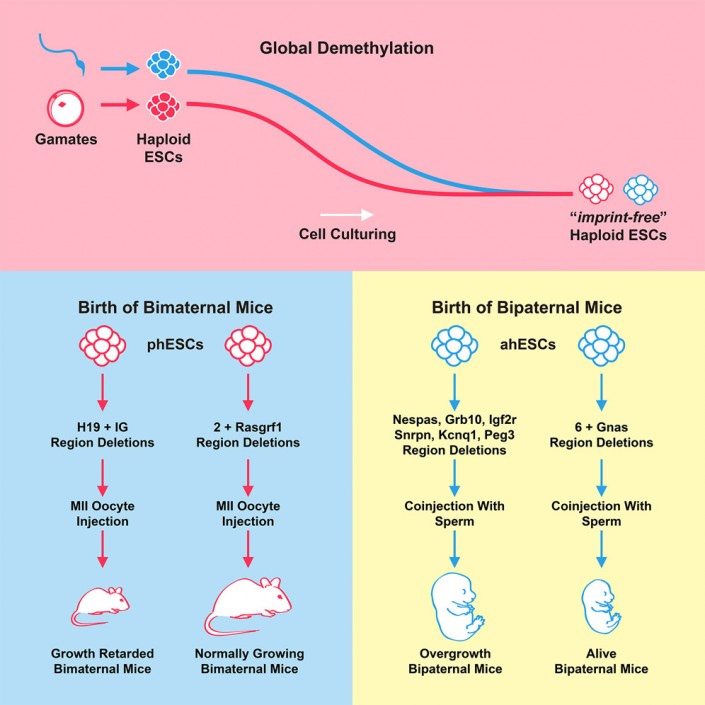 Производится эта настройка за счет химического присоединения к соответствующим участкам ДНК метильных групп, и для нормального развития потомства ее необходимо "обнулить". Такую работу проделали Ху Баоян и его коллеги из Китайской академии наук. Авторы выделяли гаплоидный (одинарный) геном у двух самок мышей, после чего использовали генно-модифицированную технологию CRISPR для точечного включения трех подавленных генов, важных для развития стволовых клеток.