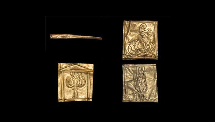 После тщательного изучения содержимого и фильтрации заполнявшей саркофаг жидкости, ученые также обнаружили внутри несколько тонких золотых пластинок размером примерно 5*3 сантиметра, покрытых символическими и вполне реалистичными изображениями.