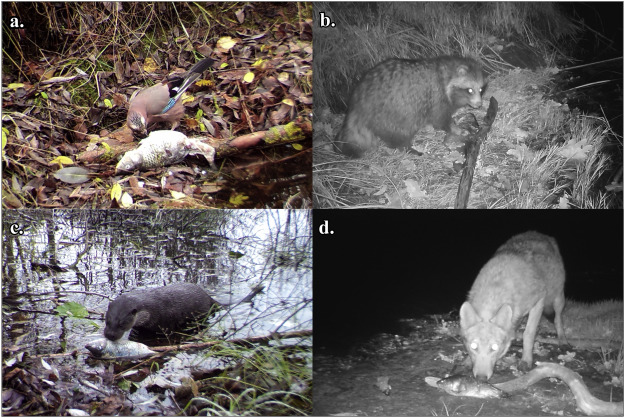 Более крупные животные, включая енотовидную собаку, восточную норку, обыкновенную выдру, волка, ворона и орлана-белохвоста, полностью съедали добычу.