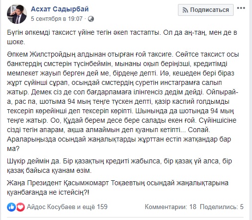 Ал продюсер Асхат Садырбай әпкесін үйіне дейін тегін әкеліп тастаған такси жүргізушісінің оқиғасын баяндапты. Оның айтуынша, несиесі өтелген такси жүргізушісі қуанғанынан әкеле жатқан жолаушысынан жолақы алмай қойыпты.