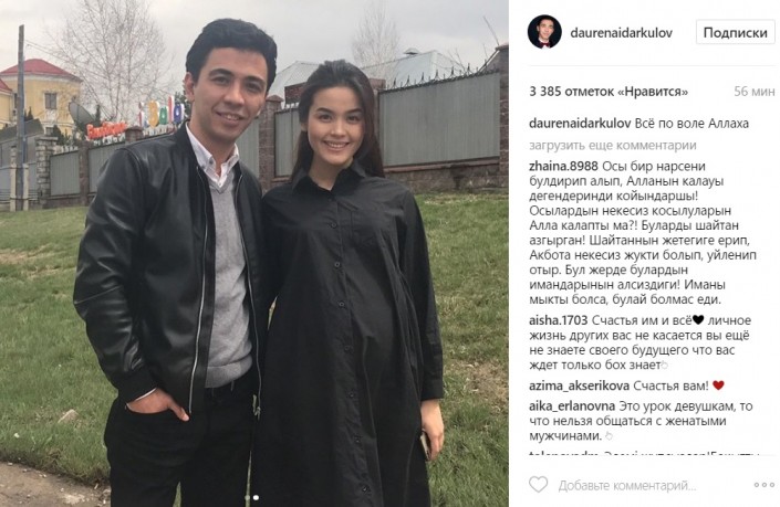 А в середине апреля Айдаркулов выложил совместную фотографию с Сейтмагамбет. Сам КВНщик тогда заявил, что его "все устраивает". "Все что сейчас происходит - нормально. Ничего страшного. Пусть они (пользователи, оставляющие негативные комментарии к фото - прим. автора) живут своей жизнью. Фото, что выставляю - по ним можете делать выводы сами. Пожалуйста, понимайте, как хотите. Я ничего не хочу объяснять. Пока вот так", - сказал Айдаркулов.