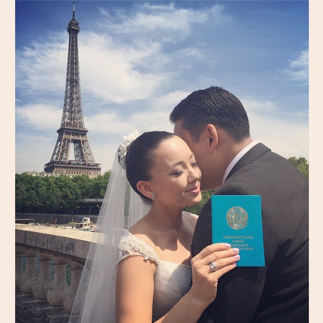 "Бакытыма шек жок ("Я безгранично счастлива")", - подписала Асем свадебную фотографию. На снимке, сделанном в Париже, артистка в свадебном платье и с обручальным кольцом на безымянном пальце обнимает своего избранника. При этом в руке она держит свидетельство о браке.